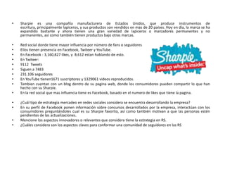 El documento presenta información sobre varias empresas y su presencia en redes sociales. Se detalla la cantidad de seguidores que tienen American Express, Animal Planet, Bon Bon Bum y otros en plataformas como Facebook, Twitter y YouTube, así como los productos o servicios que promocionan.