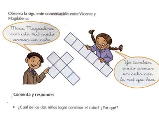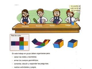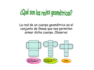 El documento explica las redes geométricas de varios cuerpos geométricos como cubos, prismas, pirámides, cilindros y conos. Define una red geométrica como el conjunto de líneas que permiten armar un cuerpo geométrico. Luego describe las características de las redes de prismas con bases triangulares, cuadradas, pentagonales y hexagonales, así como de pirámides con diferentes bases triangulares, cuadradas, pentagonales y hexagonales. Finalmente menciona brevemente las redes de