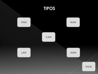 Este documento describe diferentes tipos y topologías de redes. Los tipos incluyen PAN (pequeña área de red), LAN (red de área local), MAN (red de área metropolitana), WAN (red de área amplia) y CAN (red de área de campus). Las topologías descritas son bus, estrella, token bus, CSMA/CD, anillo y redes bus en estrella jerárquica.