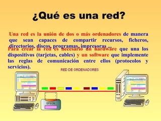 Una red es la unión de dos o más ordenadores que comparten recursos como ficheros, directorios y dispositivos mediante hardware como tarjetas de red y cables, y software que implementa protocolos de comunicación. Existen diferentes tipos de redes como LAN, MAN, WAN y VPN que varían en tamaño y alcance. Los datos se transmiten en paquetes usando protocolos como TCP, UDP e ICMP, y cada dispositivo en una red debe tener una dirección IP única.