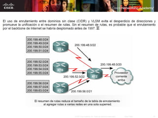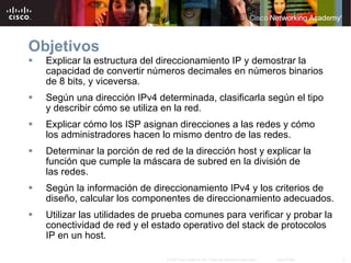 El documento explica conceptos clave de direccionamiento IPv4 como la estructura de las direcciones IP, la conversión entre números binarios y decimales, la clasificación de direcciones, la asignación de direcciones por parte de ISP y administradores, el uso de máscaras de subred, y pruebas de conectividad como ping y traceroute. El objetivo es que el lector comprenda y aplique estos conceptos para diseñar, implementar y probar redes IP.