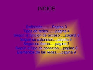 Este documento describe los diferentes tipos de redes según su función de acceso, extensión, forma y tipo de conexión. Las redes se pueden clasificar como públicas o privadas dependiendo de su acceso, y como LAN, MAN o WAN dependiendo de su alcance geográfico. Las redes más comunes son de anillo, bus o estrella según su forma, y por cable o inalámbricas según su conexión. Los elementos clave de una red incluyen estaciones de trabajo, servidores, tarjetas de red, cableado e interruptores.