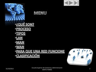 El documento describe los diferentes tipos de redes informáticas, incluyendo redes de área local (LAN), redes de área metropolitana (MAN) y redes de área extensa (WAN). Explica que una LAN conecta equipos dentro de una pequeña organización, una MAN conecta LAN cercanas a alta velocidad, y una WAN conecta LAN a largas distancias como Internet. También menciona los componentes clave de una red como módems, servidores, líneas telefónicas y software de comunicación.