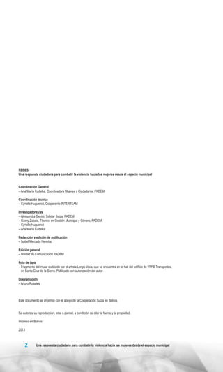 El documento detalla la creación y fortalecimiento de redes ciudadanas en Bolivia para combatir la violencia hacia las mujeres a nivel municipal. A través de la colaboración entre la ciudadanía y el estado, se han implementado acciones, servicios y campañas para erradicar la violencia de género, implicando la participación activa y corresponsable de instituciones y comunidades. Se presentan experiencias emblemáticas y aprendizajes que subrayan la necesidad de fortalecer estas redes como parte integral de un sistema municipal orientado a la prevención y atención de la violencia contra las mujeres.