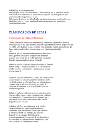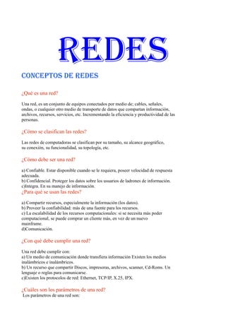 Una red es un conjunto de equipos conectados por medio de cables, señales u ondas que comparten información e incrementan la eficiencia. Las redes se clasifican por su tamaño, alcance geográfico y funcionalidad. Una red debe ser confiable, confidencial e integrada para compartir recursos como información, proveer confiabilidad y escalabilidad de recursos computacionales, y permitir la comunicación.