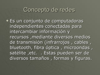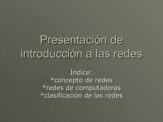 Este documento presenta una introducción a las redes, definiendo redes como conjuntos de computadoras conectadas para intercambiar información y recursos a través de varios medios de transmisión. Luego clasifica las redes en varios tipos como redes de área personal, redes de área local, redes de área de campus, redes de área metropolitana y redes de área amplia; y brinda ejemplos históricos de redes como ARPANET y DARPANET. Finalmente, define una red de área de almacenamiento como