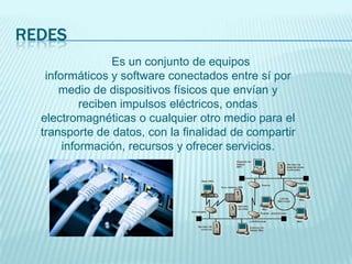 Una red es un conjunto de equipos informáticos conectados entre sí para compartir información y recursos. Las redes requieren hardware, software y protocolos para conectar dispositivos de usuario final como computadoras e impresoras y dispositivos de red que permiten la intercomunicación. El propósito de una red es interconectar computadoras y servidores utilizando cableado o tecnología inalámbrica para compartir recursos.