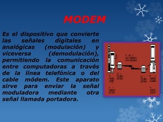 Este documento habla sobre los diferentes tipos de módems, incluyendo módems analógicos, digitales y de cable. Explica que los módems convierten señales digitales a analógicas y viceversa para permitir la comunicación entre computadoras a través de líneas telefónicas. También discute las ventajas e inconvenientes de los módems internos versus externos.