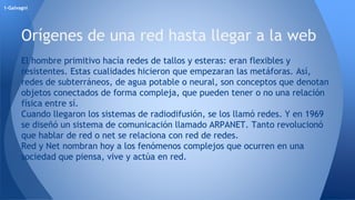 Este documento describe los orígenes y evolución de las redes desde las primeras redes creadas por el hombre hasta la actualidad. Define qué es una red, los diferentes tipos de redes según su alcance geográfico, la información transmitida y la tecnología utilizada. Explica los componentes básicos de una red informática como nodos, protocolos de comunicación y dispositivos.