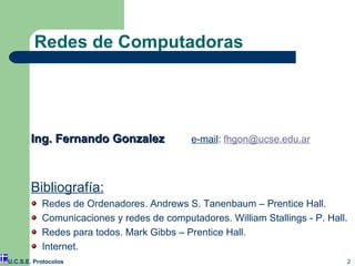 Este documento presenta el plan de estudios de la asignatura Protocolos de Redes de Computadoras en la Facultad de Matemática Aplicada de la Universidad Católica de Santiago del Estero para el año 2008, incluyendo las fechas de parciales, temas a cubrir como protocolos TCP/IP, IPX/SPX y NetBeui, y organización general de la cátedra.