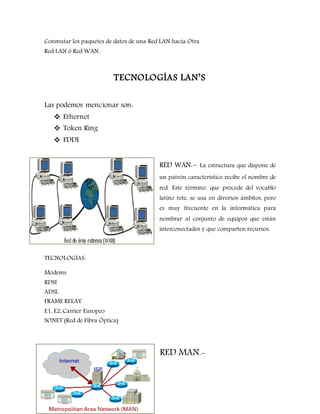 Este documento describe diferentes tipos de redes, incluyendo redes LAN, WAN, MAN, SAN y VPN. Explica que una red LAN permite compartir información entre computadoras cercanas, mientras que una WAN conecta redes más amplias a través de tecnologías como módems, RDSI y fibra óptica. También describe los dispositivos comunes de una red LAN como computadoras, tarjetas de interfaz de red, switches y routers.