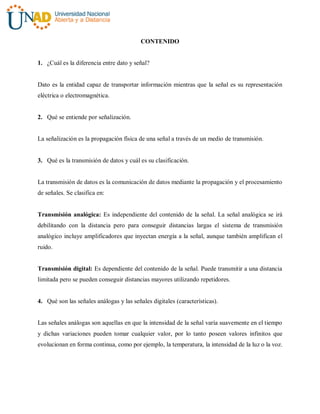 Este documento resume los conceptos fundamentales relacionados con señales, transmisión de datos, modulación y multiplexación. Define la diferencia entre datos y señales, y describe las características de las señales analógicas y digitales. Explica los componentes de una señal como amplitud, frecuencia, periodo, fase y longitud de onda. También define espectro, ancho de banda, modulación, codificación de datos y las técnicas de multiplexación.