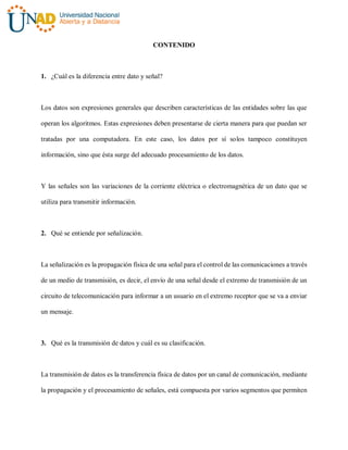 Este documento resume los conceptos fundamentales relacionados con la transmisión de datos y señales. Define datos, señales, señalización y transmisión de datos, explicando la diferencia entre transmisión analógica y digital. También describe características de señales análogas y digitales, así como conceptos como amplitud, frecuencia, periodo, fase y longitud de onda. Explica espectro, ancho de banda, modulación, codificación, multiplexación y sus diferentes técnicas.