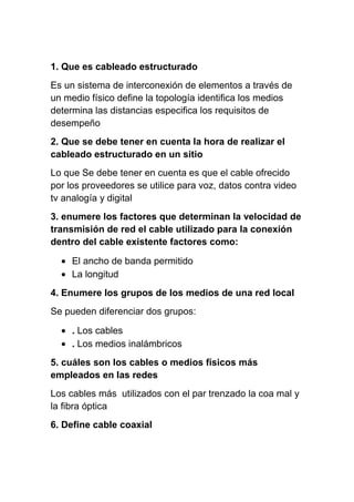 El documento describe los diferentes tipos de cables y medios físicos utilizados en las redes, incluyendo cable estructurado, cable coaxial, par trenzado y fibra óptica. Explica que el cable estructurado define la topología de red e identifica los medios y requisitos de desempeño. Los cables más comúnmente utilizados son el par trenzado, cable coaxial y fibra óptica, con cada uno teniendo diferentes velocidades de transmisión y aplicaciones dependiendo de factores como el ancho de banda y longitud del cable.