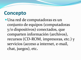 Una red de computadoras es un conjunto de equipos conectados que comparten información, recursos y servicios. Las redes se pueden clasificar por su alcance, método de conexión, topología y tipo de transmisión. Las redes se conectan a través de medios cableados como par trenzado o fibra óptica, o medios inalámbricos como radiofrecuencia. Componentes como routers, switches, hubs y servidores permiten la comunicación entre los nodos de la red.