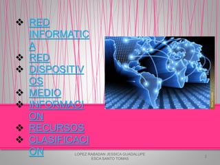 Una red informática es un conjunto de dispositivos interconectados a través de un medio que comparten información y recursos. Los dispositivos pueden clasificarse como de red para gestionar el acceso y comunicaciones o de usuario final para utilizar la red. Los medios pueden ser guiados como cables o no guiados como ondas de radio, e incluyen la información intercambiada entre los dispositivos.