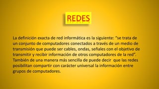 El documento describe diferentes tipos de redes informáticas. Define una red como un conjunto de computadoras conectadas a través de cables, ondas o señales para transmitir y recibir información. Luego clasifica las redes por su alcance geográfico, método de conexión, relación funcional y tipología.