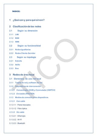 Este documento describe las redes informáticas, incluyendo su definición, clasificación según dimensión, funcionalidad y topología. Explica los elementos clave de una red local como tarjetas de red, dispositivos de interconexión, y medios de conexión. También resume brevemente el protocolo TCP/IP, el modelo OSI y las direcciones IP.