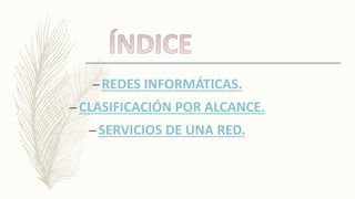 Este documento describe las redes informáticas, su clasificación por alcance e incluye una red de área personal, red de área local, red de área de campus y red de área amplia. También describe las clasificaciones por topología de red incluyendo red en bus, red en estrella, red en anillo, red en malla y red en árbol. Finalmente, detalla los servicios principales de una red como acceso a archivos, información y otros servicios como transferencia de imágenes y sonido.