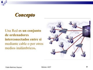 El documento explica los conceptos básicos de las redes de ordenadores, incluyendo los tipos de redes según su alcance geográfico, las topologías físicas y lógicas, y los componentes necesarios como tarjetas de red, cableado, servidores y direcciones IP.