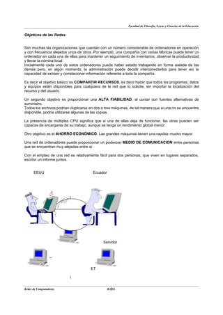 El documento proporciona una introducción a las redes de computadoras. Define una red como un sistema de comunicaciones que conecta varias unidades y les permite intercambiar información. Los objetivos principales de las redes incluyen compartir recursos entre usuarios, proporcionar alta fiabilidad al duplicar archivos en múltiples máquinas, y lograr ahorros económicos. También describe las diferencias entre sistemas distribuidos y centralizados, y explica las siete capas del modelo OSI que definen los protocolos de comunicaciones en las redes.
