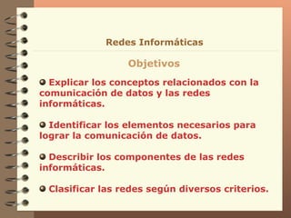 Este documento explica conceptos básicos relacionados con redes informáticas, incluyendo definiciones de comunicación de datos, elementos necesarios para la comunicación entre nodos, componentes de redes, y clasificaciones de redes según criterios como extensión geográfica, topología y relaciones lógicas entre nodos.