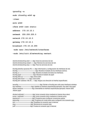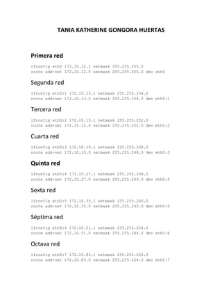 El documento describe cómo configurar múltiples redes en una interfaz Ethernet utilizando ifconfig y route. Se configuran 8 redes separadas en la interfaz eth0 utilizando diferentes máscaras de subred y direcciones IP en cada subinterfaz eth0:x. También proporciona comandos para administrar servicios y configuraciones de red e inspeccionar el tráfico de red.
