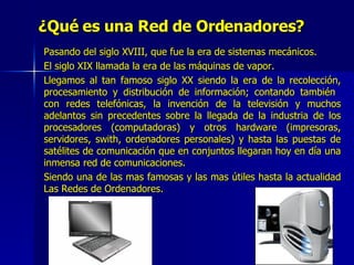 Una red de ordenadores es un conjunto de ordenadores interconectados que permiten el intercambio de información de todo tipo como texto, sonido, imágenes y software de forma casi instantánea a través de cables de cobre, fibra óptica u otros medios. Existen diferentes tipos de redes clasificadas por su área de cobertura: las redes de área local (LAN) cubren edificios o campus, las redes de área metropolitana (MAN) se extienden a toda un área urbana, y las redes de área extendida (WAN)