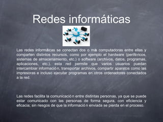 El documento describe las redes informáticas y cómo conectan computadoras para compartir recursos como hardware y software, permitiendo el intercambio de información entre usuarios. También describe varias topologías de red como estrella, bus, anillo, malla y árbol.