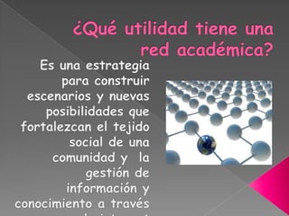 Las redes académicas son espacios para reflexión, debate y articulación de proyectos entre académicos. Permiten mejorar la educación, investigación e interacción a distancia entre instituciones. También son herramientas para que académicos e investigadores participen en actividades científicas y académicas usando tecnologías avanzadas.