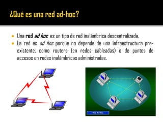 Una red ad hoc es una red inalámbrica descentralizada que no depende de una infraestructura preexistente. Las redes ad hoc están compuestas de nodos conectados por enlaces que pueden conectarse o desconectarse dinámicamente, lo que requiere que la red sea capaz de manejar cambios en su estructura de manera eficiente y escalable. Las redes ad hoc son útiles para aplicaciones donde no se cuenta con nodos centrales y son comúnmente implementadas hoy en día para transferencia de datos entre dispositivos móviles y otros apar