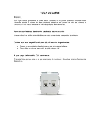 Este documento proporciona información sobre varios componentes clave del cableado estructurado para redes de datos. Define y describe brevemente cada uno de los siguientes elementos: tomas de datos, face plate, jack RJ-45, tomas de corriente, canaleta, patch cord, cableado permanente, plug RJ-45, patch panel, switch y routers. Además, indica a qué capa del modelo OSI pertenece cada componente, principalmente la capa física debido a que son los elementos físicos que permiten la transmisión y recepción de datos.