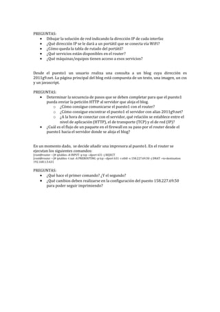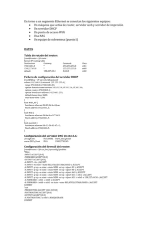 Una red local Ethernet conecta varios dispositivos como un router que hace de servidor DHCP, DNS y de impresión, un punto de acceso WiFi, un NAS y un equipo de sobremesa. El router enruta el tráfico entre la red local 192.168.1.0/24 y Internet a través de su interfaz eth0 con IP 158.227.65.0/24. El servidor DHCP asigna direcciones a los dispositivos conectados.