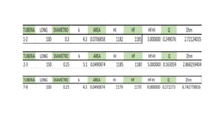 El documento describe el método de Newton-Raphson para resolver redes cerradas. Este método corrige simultáneamente las suposiciones de caudal y altura piezométrica para toda la red, lo que permite converger más rápido que otros métodos como Hardy Cross. Los pasos incluyen suponer valores iniciales, calcular caudales, perdidas y nuevas alturas, y repetir el proceso iterativamente hasta que los valores converjan. El método utiliza ecuaciones matriciales y es más adecuado para su uso computacional que manual debido a su complej