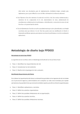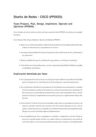 El documento describe las seis fases del ciclo de vida de una red según el modelo PPDIOO de Cisco: Preparar, Planificar, Diseñar, Implementar, Operar y Optimizar. Explica que este enfoque ayuda a reducir costos, mejorar la disponibilidad de la red, agilizar los negocios y acelerar el acceso a aplicaciones y servicios. Luego, detalla cada una de las fases del modelo y la metodología para identificar requerimientos del cliente en las primeras etapas de preparación y planificación.