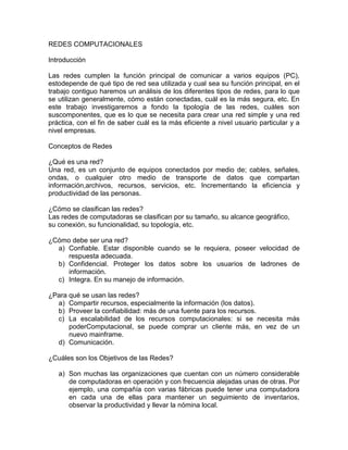 Este documento trata sobre las redes computacionales. Explica qué es una red, cómo se clasifican las redes por tamaño, alcance geográfico, conexión y funcionalidad. También describe los objetivos, componentes, tipos y razones para instalar redes.
