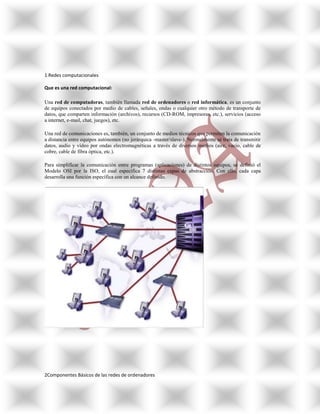 Este documento describe los componentes básicos de las redes de computadoras, incluyendo ordenadores, tarjetas de red, adaptadores de red, servidores, impresoras y otros dispositivos. También explica cómo las redes se pueden clasificar por alcance, método de conexión, relación funcional, topología y direccionalidad de los datos.