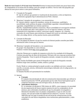 El documento proporciona conceptos clave sobre redes de computadoras, incluyendo definiciones de redes, servidores, estaciones de trabajo y tipos de servidores. También explica conceptos como navegadores, buscadores, Internet, la World Wide Web y sus elementos constituyentes como HTML, hipertexto e hipervínculos. El estudiante responde 11 preguntas proporcionando definiciones y ejemplos para cada concepto.