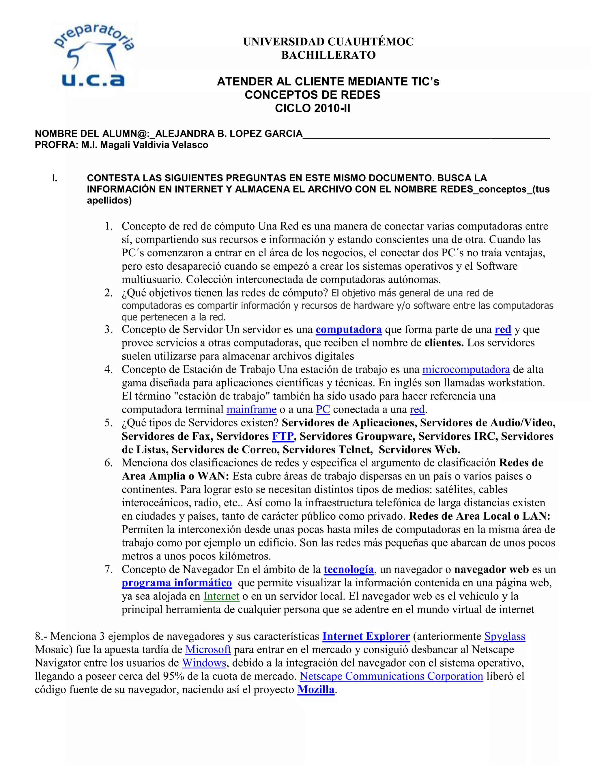 El documento proporciona definiciones y conceptos clave sobre redes de computadoras e Internet. Explica que una red es una colección interconectada de computadoras que comparten recursos e información. Define tipos de servidores, estaciones de trabajo, clasificaciones de redes, navegadores, buscadores, e hitos históricos de Internet y la World Wide Web. También describe elementos básicos de la web como HTML.