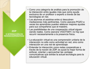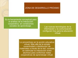 La zona de desarrollo próximo (ZDP) identifica dos niveles de desarrollo de una persona: lo que puede hacer solo y lo que puede aprender con ayuda. El aprendizaje se centra en ampliar las posibilidades a través de la interacción con personas más experimentadas. Las ZDP pueden usarse para diseñar redes de aprendizaje cooperativo en entornos virtuales donde la interacción con tutores o compañeros guíe el aprendizaje.