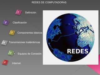 Este documento define las redes de computadoras y clasifica los diferentes tipos de redes según su cobertura, topología y relación funcional. Explica los componentes básicos de una red como computadoras, placas de red, cables y equipos de conexión. También describe las transmisiones inalámbricas, dando ejemplos como Bluetooth e IEEE 802.11.