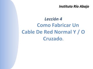 El documento explica cómo fabricar cables de red normales y cruzados. Detalla los componentes necesarios como cable trenzado UTP, terminales RJ45, crimpadora y diferentes estándares de colocación de los cables en los terminales (568A y 568B). Explica la diferencia entre cables normales y cruzados y cómo afecta el orden de los cables en cada terminal. Recomienda no unir cables con empalmes y medir bien la longitud requerida.