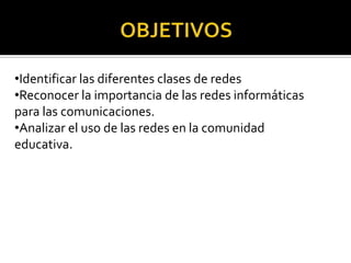 Una red informática permite compartir recursos como hardware y software entre ordenadores conectados. El documento describe los tipos de redes según su alcance (PAN, LAN, MAN, WAN), medio (cableado, inalámbrico) y topología (bus, anillo, estrella, árbol). También explica dispositivos como tarjetas de red, cables, concentradores, conmutadores, routers y el protocolo TCP/IP.