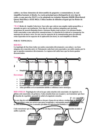 Este documento define y clasifica las redes de computadoras. Explica que una red conecta computadoras para compartir información y recursos a través de enlaces físicos o inalámbricos. Clasifica las redes por su extensión (LAN, MAN, WAN) y topología (bus, anillo, estrella, jerárquica, híbrida), describiendo las características de cada tipo.