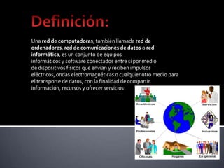 Una red de computadoras conecta equipos informáticos mediante dispositivos físicos que comparten información y recursos. Un sistema operativo de red permite la interconexión de ordenadores para acceder a servicios, mientras que el software de aplicación proporciona programas y archivos a los usuarios. El hardware necesario incluye tarjetas de red, computadoras personales, terminales y dispositivos de red como conmutadores, enrutadores y puntos de acceso inalámbricos para formar la red.