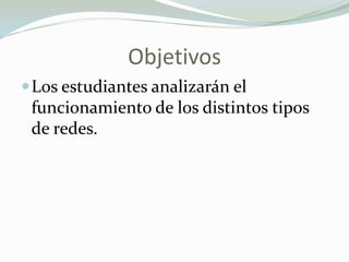 El documento describe los diferentes tipos de redes de computadoras, incluyendo redes alámbricas, inalámbricas, PAN, LAN, MAN, WAN y Bluetooth. Explica los componentes clave de las redes como routers, switches, puntos de acceso, adaptadores y antenas. También diferencia entre redes alámbricas e inalámbricas.