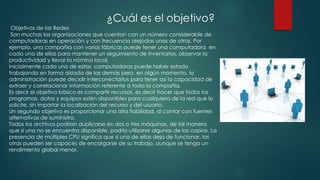 Este documento describe los objetivos, antecedentes, aplicaciones, componentes, tipos, topologías y características de las redes de computadoras. Los objetivos principales de las redes son compartir recursos como programas, datos y equipos entre usuarios sin importar su ubicación, y proporcionar alta fiabilidad mediante copias de archivos en múltiples máquinas. Las primeras redes incluyen ARPANET en 1969. Las aplicaciones comunes son LAN, MAN y WAN. Las topologías principales son malla, estrella, árbol, bus