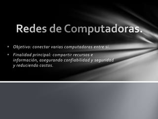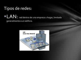 Este documento describe las redes de computadoras y la Internet. Explica los tipos de redes como LAN, WAN, MAN y PAN. También describe los tipos de conexión a Internet como RTC, RDSI, ADSL, satélite e inalámbrica. Finalmente, resume los principales servicios de Internet como el World Wide Web, FTP, correo electrónico, newsgroups, listas de correo, chat y videoconferencia.