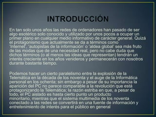 El documento describe la evolución y el crecimiento de las redes de ordenadores desde algo esotérico a principios de los años 90 a una parte fundamental de la sociedad actual. Explica los diferentes tipos de redes, incluyendo redes de área local (LAN), redes de área extensa (WAN) y redes de área metropolitana (MAN), así como las tecnologías asociadas como Ethernet, Token Ring y FDDI. También distingue entre redes broadcast, donde el medio de transmisión es compartido, y redes punto a punto, que usan conex