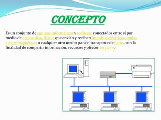 El documento describe los conceptos básicos de una red, incluyendo que una red es un conjunto de equipos informáticos conectados que comparten información y recursos. Explica que las redes requieren hardware como tarjetas de red, computadoras, servidores y dispositivos de red como conmutadores y enrutadores, así como software de aplicaciones y protocolos de red como el modelo OSI y TCP/IP.